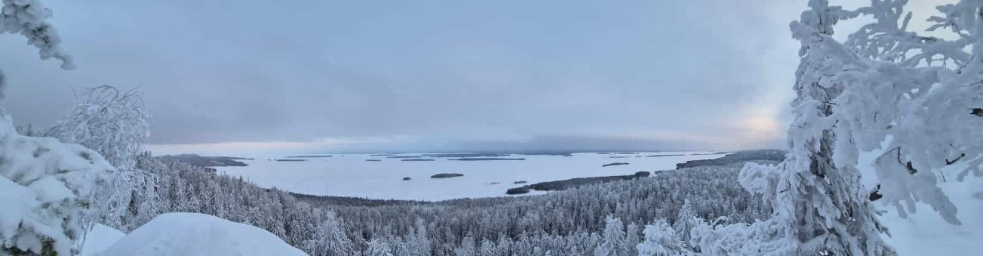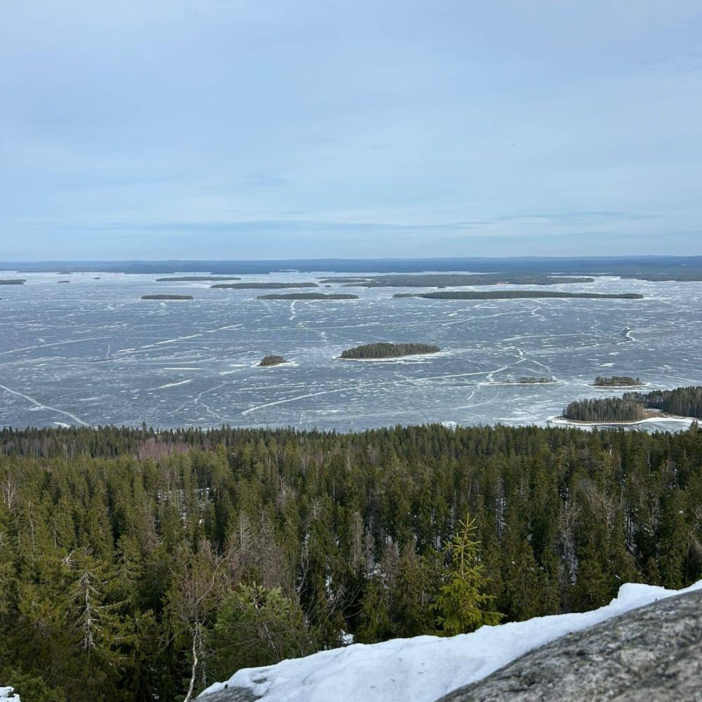 Wir starten bei uns in der Region Lieksa und machen uns gemeinsam auf den Weg zum Koli Nationalpark. - Atemberaubende Ausblicke: Nach einem kurzen Aufstieg wirst du mit einem spektakulären Blick über den gefrorenen Pielinen belohnt – einer der schönsten Aussichtspunkte Finnlands.